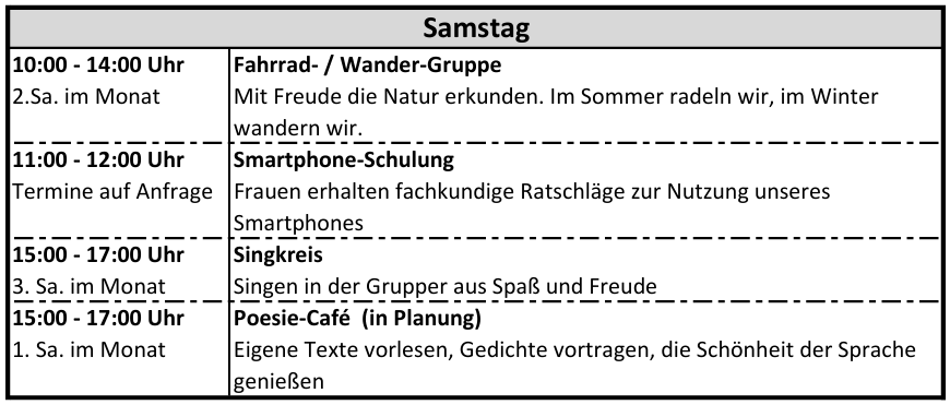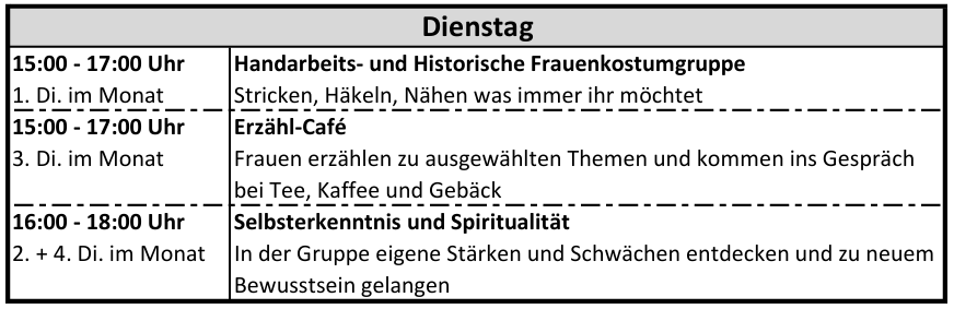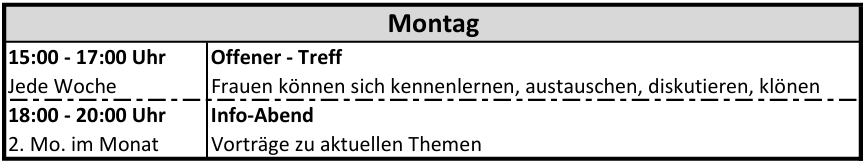 | Gesprächskreis „Frauen finden sich“ | Donnerstags | 9:00 – 12:00 h | wöchentlich |