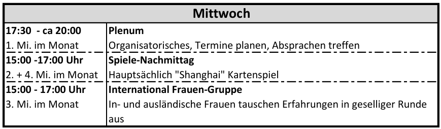 | Internationale Frauen | Mittwochs | 15:00 – 17:00 h | 3. Mi / Monat |