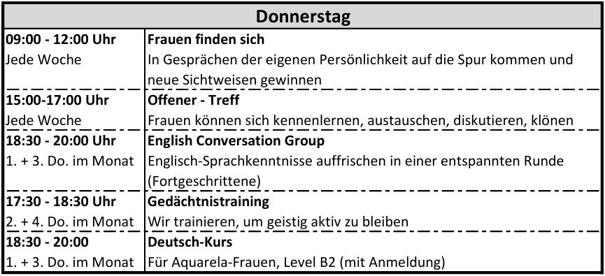 | Deutschkurs für Aquarela Frauen, Level B2 (mit Anmeldung) | Donnerstags | 18:30 – 20:00 h | 2. + 4. Do / Monat |