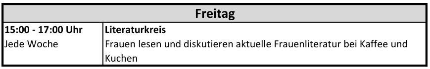 | Literaturkreis | Freitags | 15:00 – 17:00 h | wöchentlich |