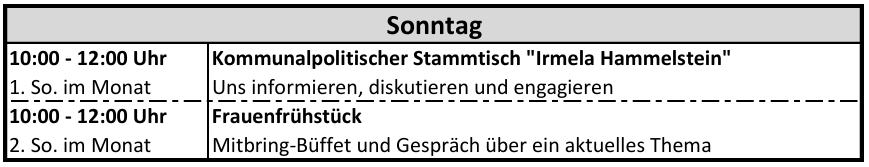 | Kommunal-politischer Stammtisch „Irmela Hammelstein“ | Sonntags | 10:00 – 12:30 h | 1. So / Monat |